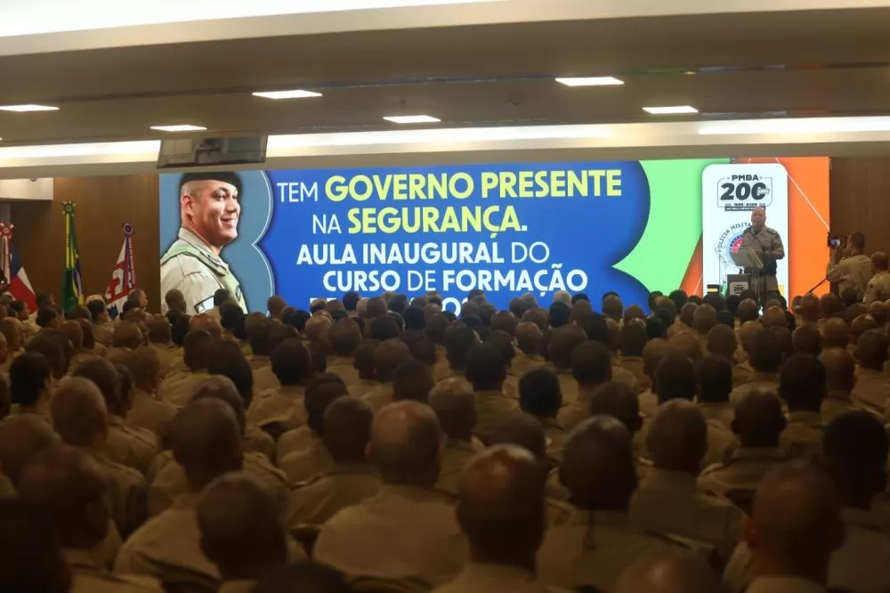 A segunda turma da formação de soldados da Polícia Militar da Bahia (PM-BA) do concurso de 2022 foi recepcionada, nesta segunda-feira (27), pelo governador Jerônimo Rodrigues, pelo vice-governador Geraldo Júnior, pelo secretário Marcelo Werner, da Segurança Pública, e pelo comandante-geral da corporação Paulo Coutinho, no Centro de Cultura Cristã da Bahia. Participaram da aula inaugural do curso, que se estende pelos próximos 11 meses, 1092 novos alunos soldados de forma presencial e mais 796 de outros municípios baianos remotamente.