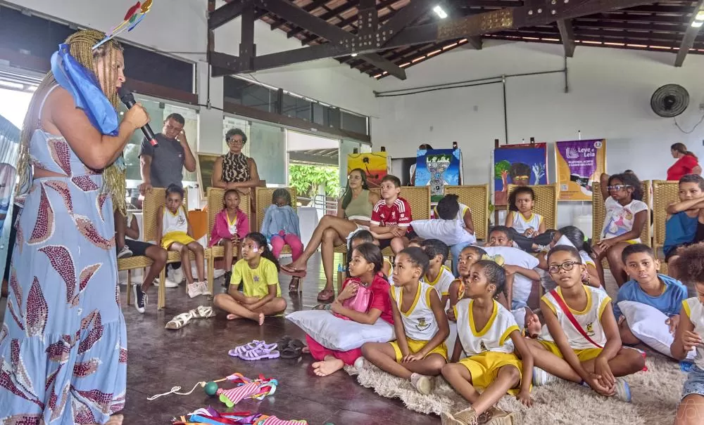 Em seguida, às 10h, Anderson Shon conduziu o bate-papo sobre O sítio da Tia Naná, em um encontro que misturou humor, memória e participação ativa das crianças, transformando o espaço em um grande quintal imaginado. À tarde, a programação seguiu celebrando ancestralidade e território. Poranga Tupinambá de Olivença trouxe histórias que conectam infância e tradição, aproximando o público das cosmologias indígenas. Para fechar o dia, às 15h, Ana Fátima apresentou a história No sítio do Vovô Dandi, que fez as crianças viajarem por afetos, brincadeiras e vínculos geracionais que marcam a literatura para a infância produzida no sul da Bahia.